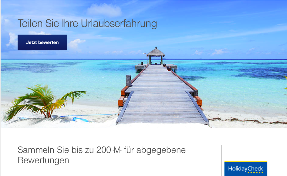 Dass man mit Bewertungen bei Holidaycheck.de kostenlos Prämienmeilen sammeln kann, dürfte vielen bekannt sein. Im August sammelt Ihr sogar bis zu 200 Prämienmeilen auf Eure Bewertungen. Je mehr Bewertungen Ihr schreibt, des so mehr Meilen sammelt Ihr.