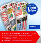 Mit dem 8 Wochen Abo der Bild am Sonntag könnt Ihr super günstig 1.500 Paybackpunkte und damit Miles&More Meilen mitnehmen. Wenn Ihr mit Bankeinzug bezahlt, erhaltet Ihr nochmal 500 Paybackpunkte extra. In Summe also 2.000 Paybackpunkte.