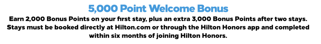 Offer is valid for any eligible stays booked directly with Hilton through Hilton-approved booking channels and completed within six months (“Promotion Period”), beginning the day, the participant enrolls in Hilton Honors, at any hotel or resort in the Hilton Portfolio All stays must be completed in the 6 months following enrollment date to earn Bonus Points.