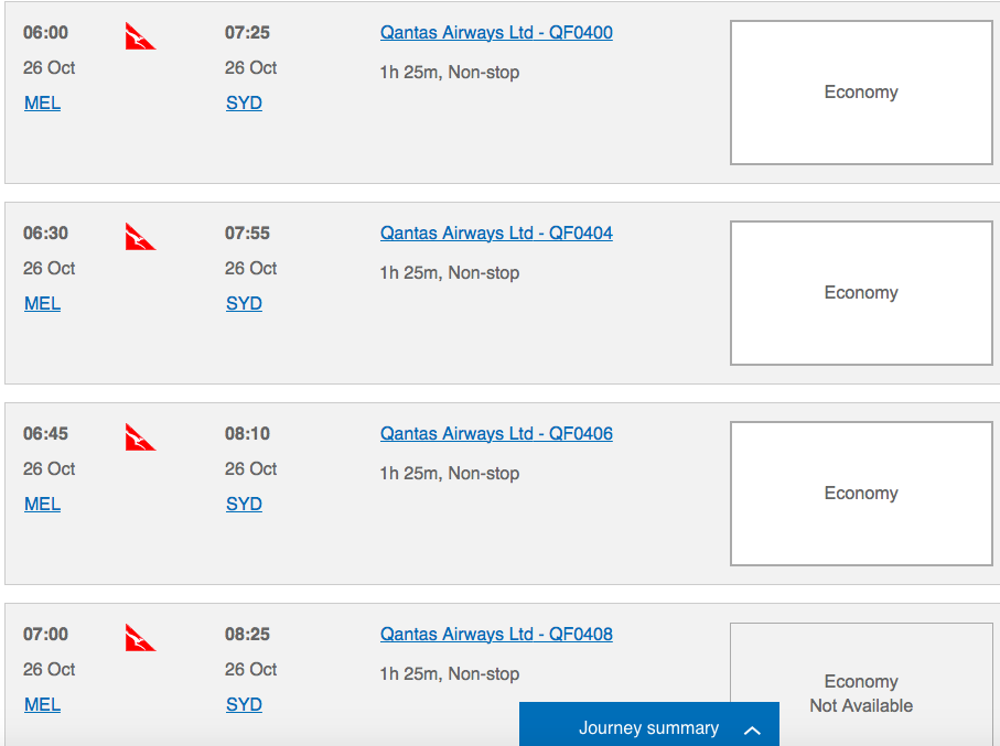 Ab hier wird es sehr intuitiv. Ihr gebt die gesuchte Strecke (im Beispiel Melbourne nach Sydney) und das Datum ein und wählt auf der nächsten Seite Euren Flug aus.