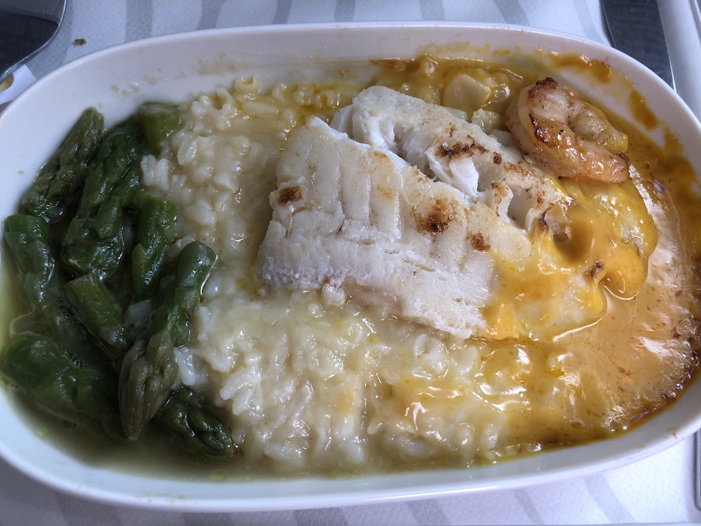 Eine Auswahl wurde ebenfalls nicht angeboten. Das Menü bestand aus einem Erbsen-Feta Salat, Brot, Fisch mit Spargel und Reis sowie einem Beerenkuchen. Es folgte eine weitere Getränkerunde mit Kaffee und Tee. Nach dem Loungebesuch war die Menge für mich mehr als ausreichend, für den zweistündigen Flug eine gute Leistung in Sachen Catering.