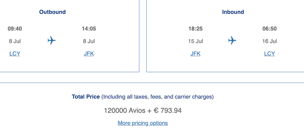 Der Hin- & Rückflug mit dem „Baby-Airbus“ A318 mit reiner Business Class Bestuhlung kostet 120.000 Avios. Während der Aktion könnt Ihr die benötigten Meilen für 1.476€ kaufen. Die hohen Steuern machen das Ganze leider weniger attraktiv. Das Produkt ist aber einmalig und oftmals sehr hochpreisig.
