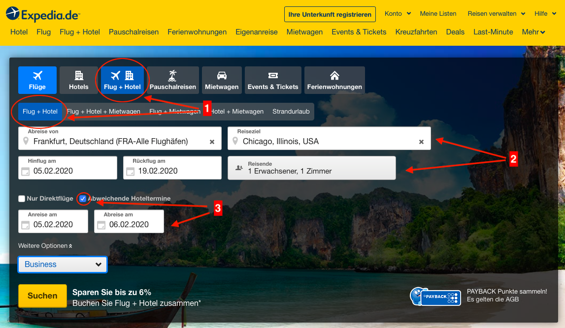 1. Wichtig ist, dass Ihr bei Expedia die Funktion Hotel+Flug wählt. Hierdurch bucht Ihr ein Hotel mit einem Flug zusammen.