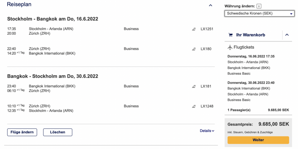 Grundsätzlich könnt Ihr ab jedem Flughafen in Schweden starten und über die Lufthansa Webseite auch jede beliebige Kombination aus Lufthansa, Austrian Airlines und Swiss buchen. Somit könnt Ihr z.B. auf dem Hinweg Swiss und auf dem Rückweg Austrian Airlines fliegen und so auch verschiedenen Produkte testen und Flugzeiten vergleichen.