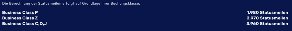 Insbesondere bei den hochwertigeren Buchungsklassen ist die Ausbeute im Vergleich zu der für Angebote vorgesehene Klasse „P“ sehr hoch. Bei Hin- und Rückflug, Zubringern, dem Executive Bonus sowie der Kulanzregelung in diesem Jahr (Verdoppelung der Statusmeilen) werden Euch so etwa 20.000 Statusmeilen gutgeschrieben.