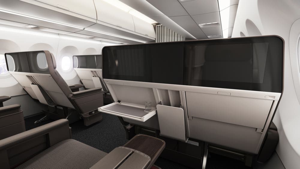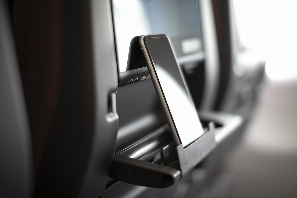 Zwischen Business und Economy Class befindet sich eine fest installierte Wand, jeder Sitz ist mit einem eigenen Monitor ausgestattet. Über USB-Anschlüsse können private Endgeräte aufgeladen werden, es gibt eigene Halterungen für Smartphones.