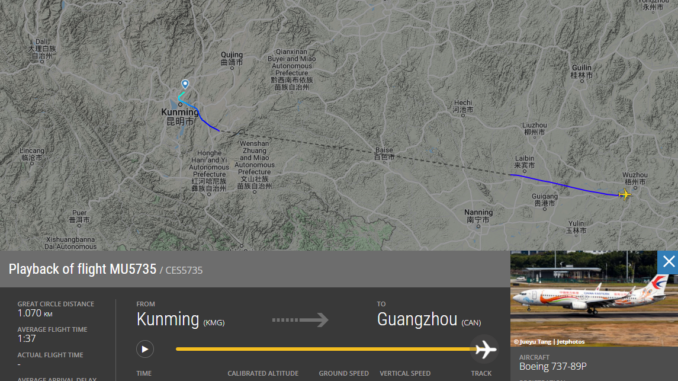 Auf Flightradar24 kann Flug MU5735 von China Eastern Airlines nachverfolgt werden. Der Flug startete um 13:11 Uhr Ortszeit nahezu pünktlich in der chinesischen Metropole Kunming (KMG). Zwischenzeitlich zeigt Flightradar24 jedoch keinen Flugverlauf auf, ehe nahe des Ortes Laibin das Flugzeug auf einer Höhe von etwa 29.000 Fuß wieder auftaucht. Diese Höhe hält die Maschine noch eine Weile, ehe sie in einen drastischen Sinkflug gerät. Ein letztes Signal von Flug MU5735 wird um 14:22 Uhr Ortszeit (7:22 MEZ), etwa 40 Minuten vor der geplanten Ankunft in Guangzhou verzeichnet. Zu diesem Zeitpunkt hat die Boeing 737 nur noch eine Höhe von 3.225 Fuß und 376 Knoten Geschwindigkeit. Dann verliert sich das Signal etwas südlich des Ortes Wuzhou und damit nur noch etwa 300km vom eigentlichen Ziel Guangzhou entfernt.