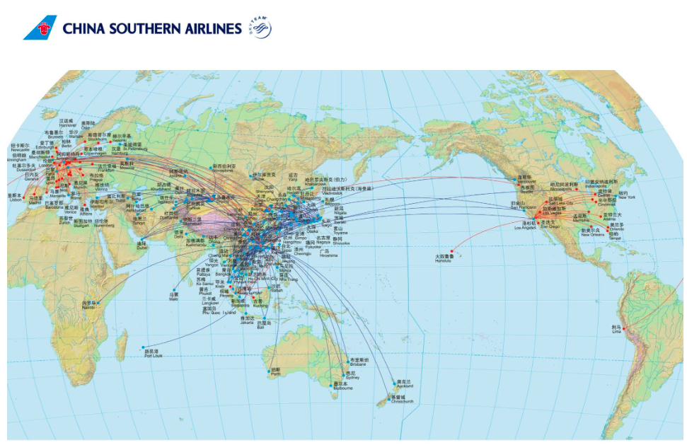 China Southern betreibt ein extrem dichtes Streckennetz innerhalb von China und Asien. Neben dem Hub in Guangzhou, unterhält man auch noch Drehkreuze in Peking, Chongquing, Ürümqi.