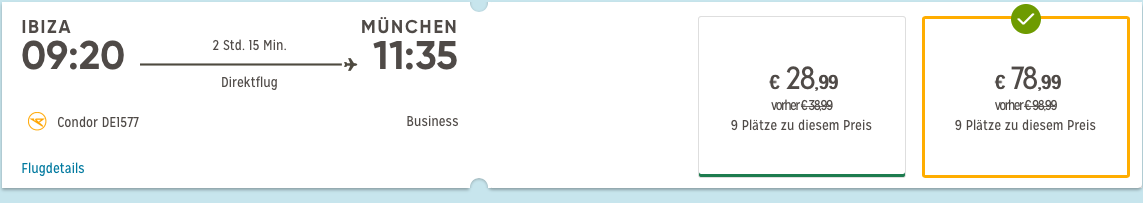 Leider fliegt Condor aktuell nur einmal pro Woche jeweils samstags nach Ibiza, sodass man immer eine Woche vor Ort bleiben muss oder man bucht nur einen oneway Flug mit Condor, was in der Business Class nach Ibiza ab 79 Euro möglich ist. Rückflüge an andere Tagen lassen sich z.B. auch mit Lufthansa finden.