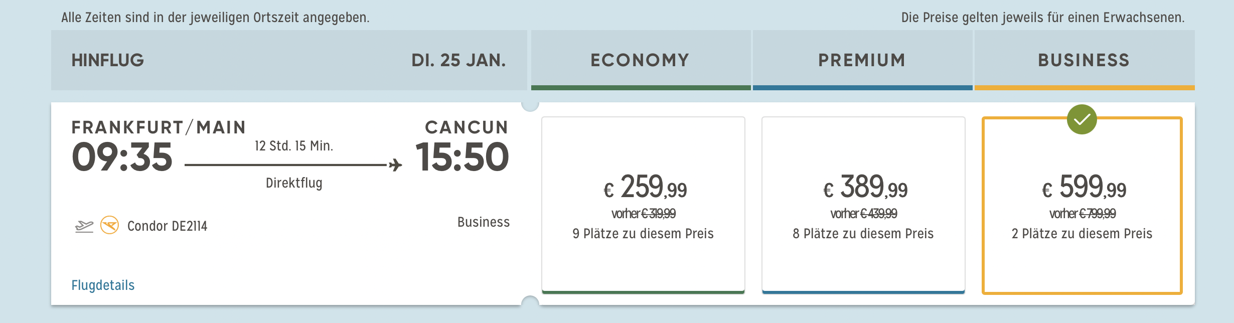 Übrigens erlaubt Condor auch, dass man auf Hin- und Rückflug die Business Class mit der Economy oder Premium Economy Class kombiniert, wodurch man den Flugpreis auch noch einmal senken kann.