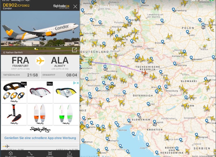 Etwas später kam mir der ungewöhnliche Flug wieder in den Sinn und ich durchforstete den virtuellen Himmel auf flightradar24.com nach der Boeing 767 von Condor. Dabei landete ich zunächst bei einer anderen und dann noch einer weiteren 767. Beide aus der Flotte des Ferienfliegers Condor. Beide in Frankfurt gestartet. Und beide mit dem Ziel Almaty in Kasachstan. Unterwegs mit den Flugnummern DE860 und DE902. Ein paar Klicks später war dann auch wieder die D-ABUI mit der Flugnummer DE850 auf dem Schirm (ich hatte mir zuvor die Flugnummer nicht gemerkt). Mittlerweile stand auch das Ziel fest. Und auch für diese Maschine sollte es nach Almaty gehen.