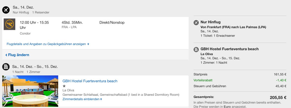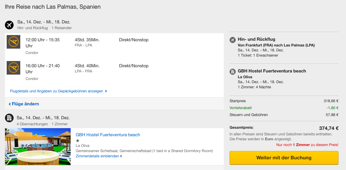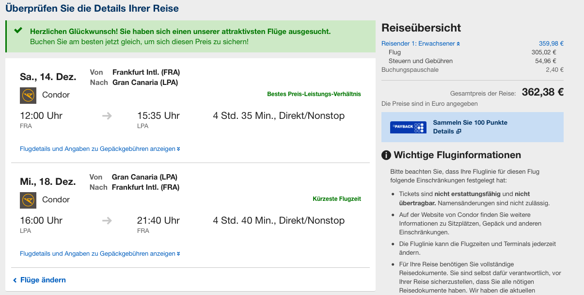 Ein Condor Hin- und Rückflug von Frankfurt nach Gran Canaria im Dezember für 362 Euro. Diese Flüge sind nicht mit einem Sicherungsschein abgesichert, da hier kein Hotel hinzugebucht wurde. Durch die Buchungspauschale von 2,40 Euro ist Expedia übrigens minimal teuerer als eine Buchung über Condor selbst.