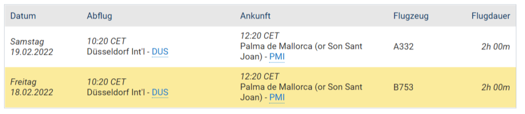 Statt Frankfurt – Teneriffa, wie es im Dezember 2021 geplant war, steht nun Düsseldorf – Palma de Mallorca auf dem Flugplan. Der Flug trägt die Flugnummer DE1514 und startet um 10:20 in Düsseldorf (DUS). Die Landung ist für 12:20 auf Palma de Mallorca (PMI) geplant.