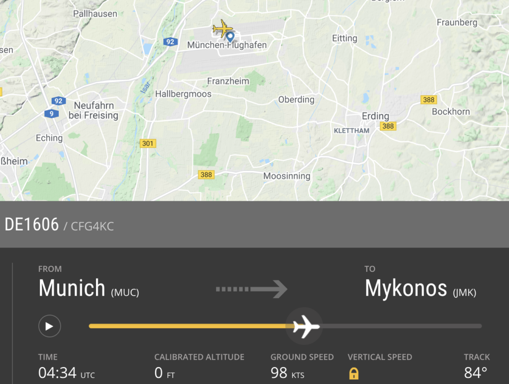 Zum Einsatz kam ein fast 23 Jahre alter A320 mit der Kennung D-AICE. Der Flug hatte die Nummer DE1606 und sollte am 18. Juni von München nach Mykonos fliegen. Auf Flightradar kann man diesen kurzen Verlauf anhand der Daten nachverfolgen und erkennen, dass die Maschine fast 100 Knoten erreicht hatte.