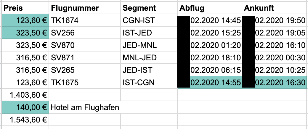 Nach einer längeren Recherche hatte ich einige mögliche Routen mit unterschiedlichen Vorteilen. Damit mir die Entscheidung leichter fällt, habe ich mir tabellarisch die Routen inkl. Kosten der einzelnen Segmente und Zusatzkosten wie Hotels aufgelistet. Im Folgenden ein Beispiel: