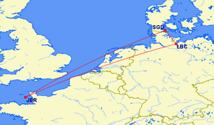 Nur 640 Meilen beträgt die Flugstrecke zwischen dem schleswig-holsteinischen Airport Lübeck (LBC) und dem Flughafen Jersey (JER). Für eine ATR 72 sollte diese Distanz ohne Probleme und ohne Tankstopp durchgeführt werden können. Und trotzdem landet Lübeck Air auf dem Weg nach Jersey derzeit regelmäßig zwischen. Statt non-stop geht es über das dänische Sonderburg (SGD) zum Ziel.
