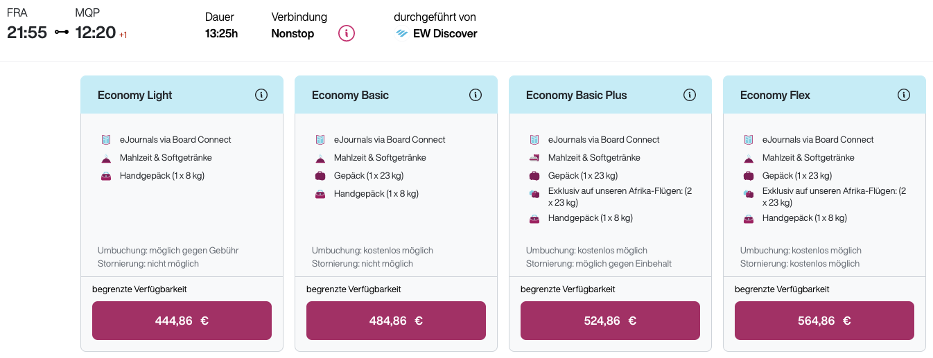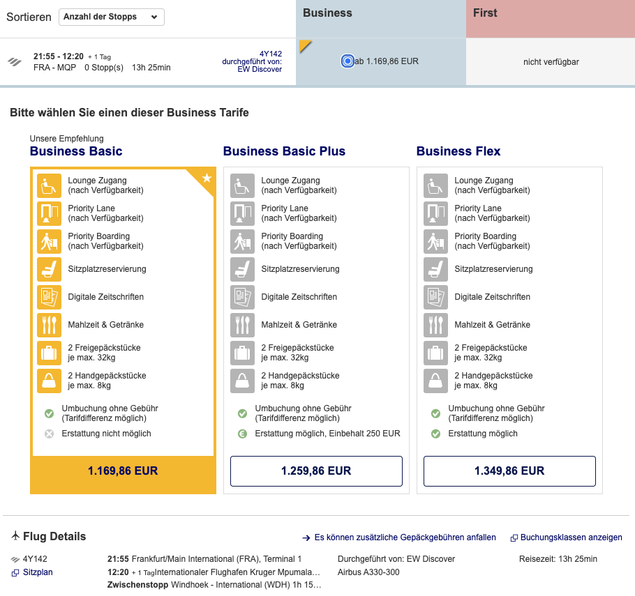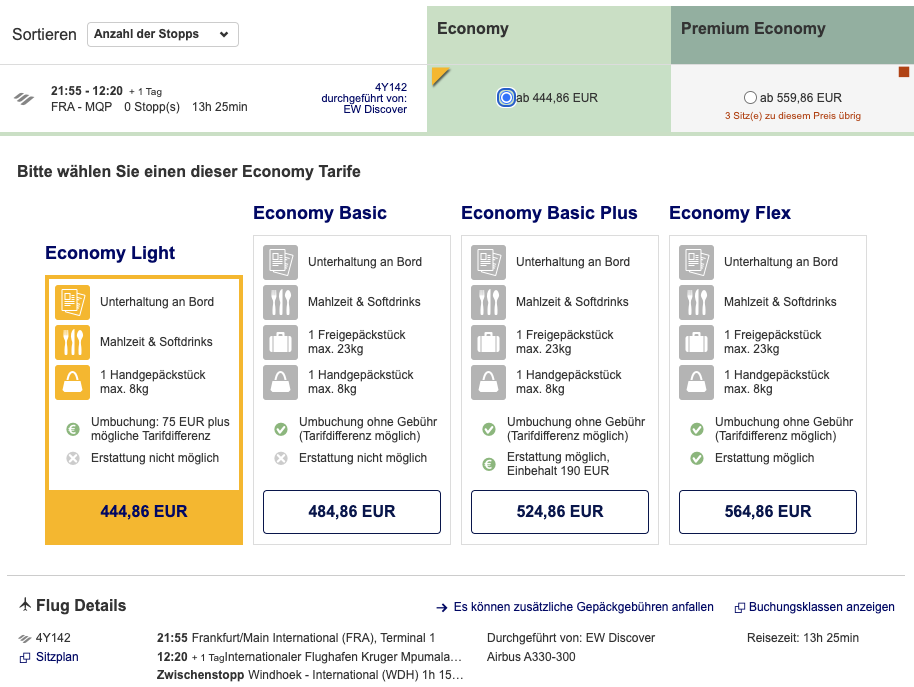 Den gleichen Flug zum Krüger Nationalpark (MQP, ab November) haben wir auf der Homepage der Lufthansa gefunden: