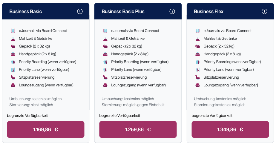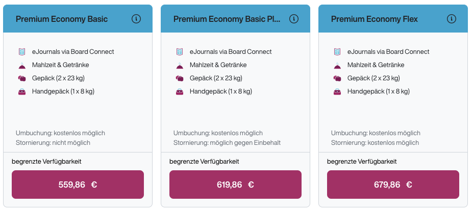 Auch die Premium Economy ist auf immer mehr Strecken verfügbar. Diese gab es zunächst nur vereinzelt, da nicht alle Maschinen die Sitze an Bord hatten. Ab Sommer soll es die Zwischenklasse zu allen Destinationen auf der Langstrecke geben. Die Business Class ist ebenfalls in unterschiedlichen Paketen zu haben, diese unterscheiden sich nur bei Umbuchungs- und Stornierungsbedingungen.