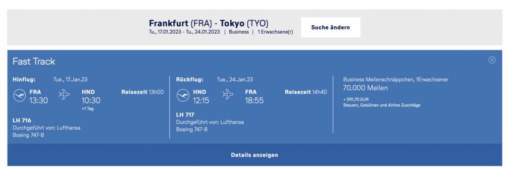 Für 70.000 Miles&More Prämienmeilen, anstelle von 142.000 Prämienmeilen kann man den Lufthansa Business Class Hin- und Rückflug nach Tokio gerade buchen.