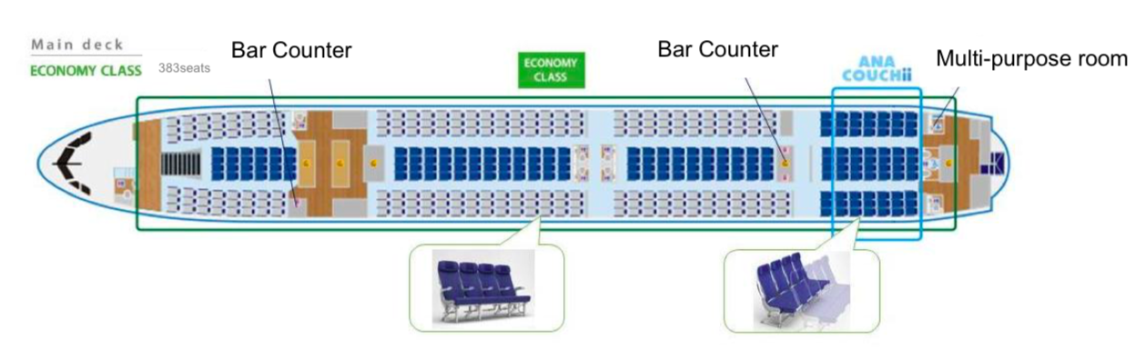 Auch der ANA Airbus A380 wird über alle vier Klassen verfügen und hierbei auf dem gesamten Oberdeck mit Premium Sitzen ausgestattet sein. Bei 8 First Class, 56 Business Class, 73 Premium Economy Class und 383 Economy Class Sitzen, zeigt man aber klar, dass der ANA Airbus A380, für ANA Verhältnisse, für den Urlaubermarkt ausgestattet wurde.