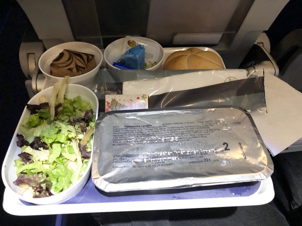 In Premium-Economy werden Speisekarten ausgegeben, die Essensauswahl ist identisch zu der in der regulären Economy-Kabine. Vorne wird das Menü lediglich in Porzellan angerichtet und die Brötchen sind warm. Es gibt eine Auswahl zweier Hauptgerichte, darunter eine vegetarische Option. Das Tablett und der Essensservice zu Beginn des Fluges sind also an sich gleich geblieben.