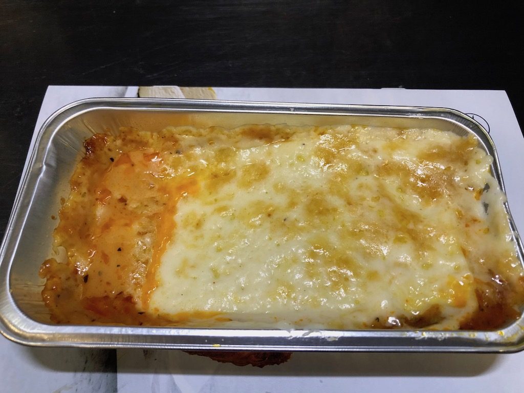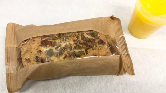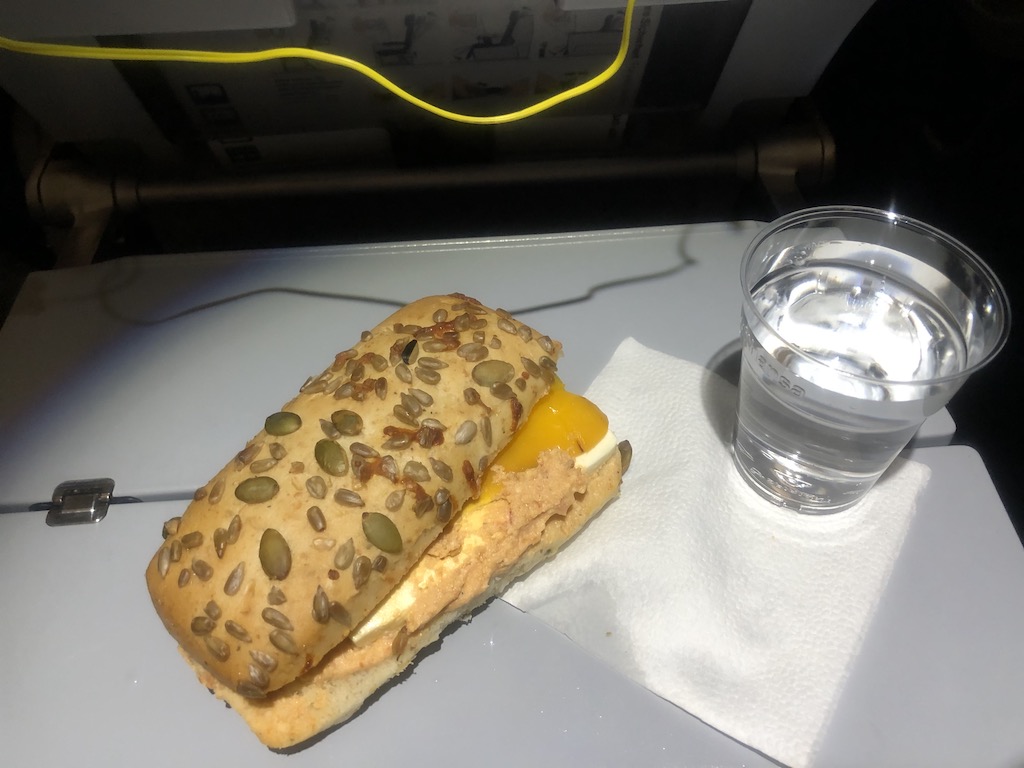 Das Sandwich war von der Grösse her zwar angemessen, optisch und geschmacklich jedoch nicht ansprechend. Natürlich kann man das nun leicht von Bord mitnehmen, allerdings muss der Hunger schon sehr groß sein. Das Brot war trocken und der Belag sogar noch etwas gefroren.