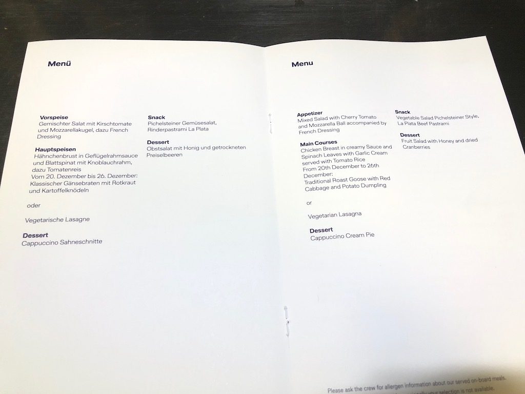 Zu Beginn wurden heisse Tücher an alle Gäste verteilt. Je nach Flugzeit gab es früher einen heißen Snack oder eine warme Mahlzeit. Bisher wurden auch immer zwei verschiedene Optionen angeboten, für die Zukunft wurde das gestrichen. Stattdessen gibt es nur noch eine vegetarische Variante wie z.B. ein Käsesandwich.
