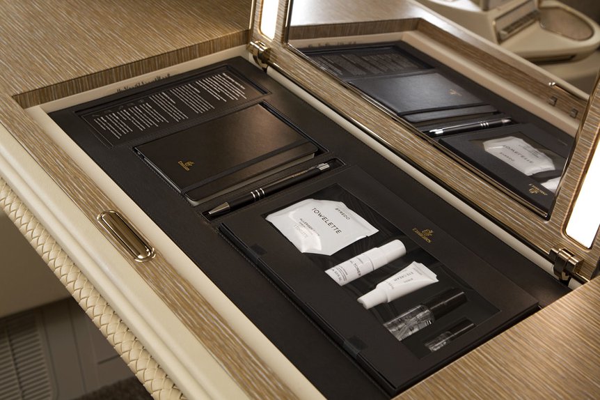 Das Schreibkit und der Schminktisch bleiben bei der neuen Emirates First Class erhalten. Auch eine Minibar soll es wieder geben.