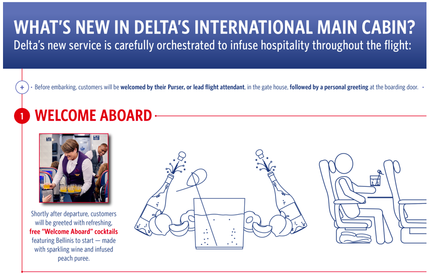 Auch wenn man sicher keinen vollen Business Class Service in der Economy Class erwarten darf, werden hier viele Aspekte aus der Premium Kabine aufgegriffen. So wird Delta Airlines noch vor dem Start einen Cocktail zur Begrüßung servieren, sowie heiße Tücher.