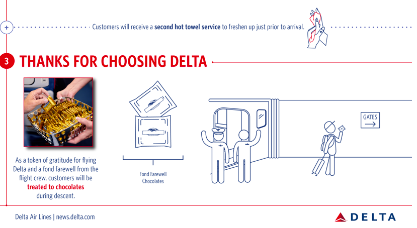 Dieser neu entwickelte Service ist aus einer Projektgruppe von 24 echten Flugbegleitern entstanden, welche sich überlegt haben, wie man den Service in der Delta Economy Class attraktiver gestalten kann. Auf über 14.000 Flugstunden hat man das Konzept anschließend verfeinert und auch das Feedback von 1.800 Passagieren mit einfließen lassen.
