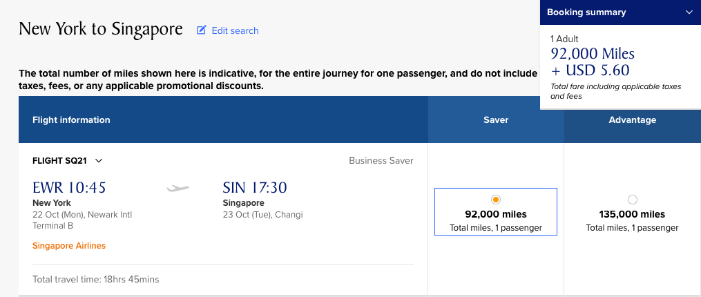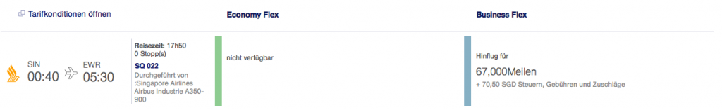 Die Meilenwerte für einen One Way ab Singapur nach Newark sind folgende.