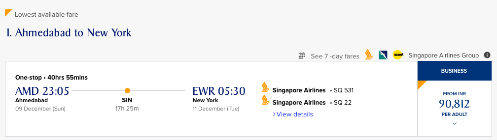 Ab Ahmedabad in Indien hat Singapore Airlines sehr günstige Business Class Angebote. Der One Way über Singapur nach New York lässt sich so ab 1.050 Euro buchen und ihr kommt in den Genuss des längsten Fluges der Welt für verhältnismäßig wenig Geld.