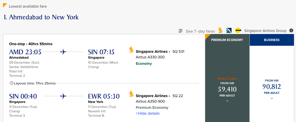 Auch in der Premium Economy Class bietet Singapore Airlines günstige Tarife ab Ahmedabad an. Hierbei fliegt ihr für 688 Euro über Singapur auf dem längsten Flug der Welt in der Premium Economy Class.
