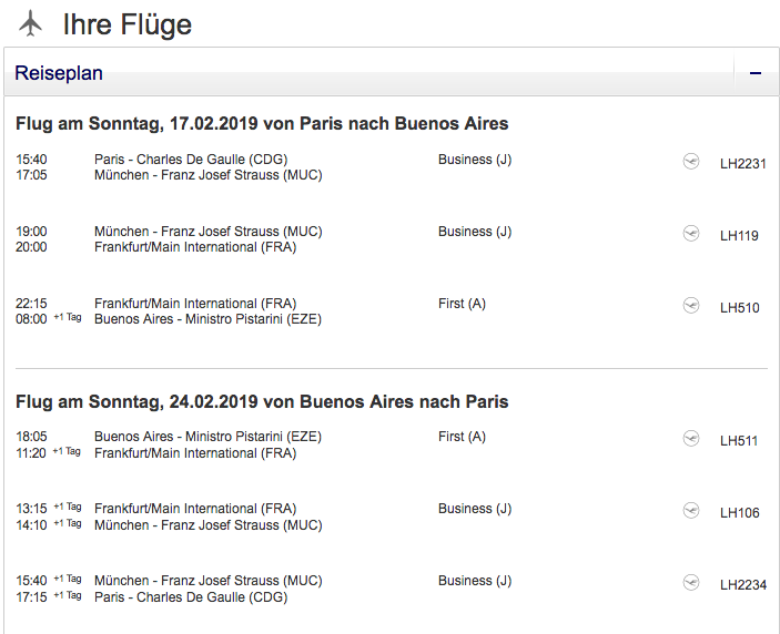 Das Angenehme an diesem Tarif ist, dass Ihr ohne große Mühen, direkt über Lufthansa.com buchen könnt und hier auch direkt ein meilenoptimiertes Routing angeboten bekommt. Dieses führt Euch von Paris über München nach Frankfurt, von wo es in der Lufthansa First Class direkt nach Buenos Aires geht.