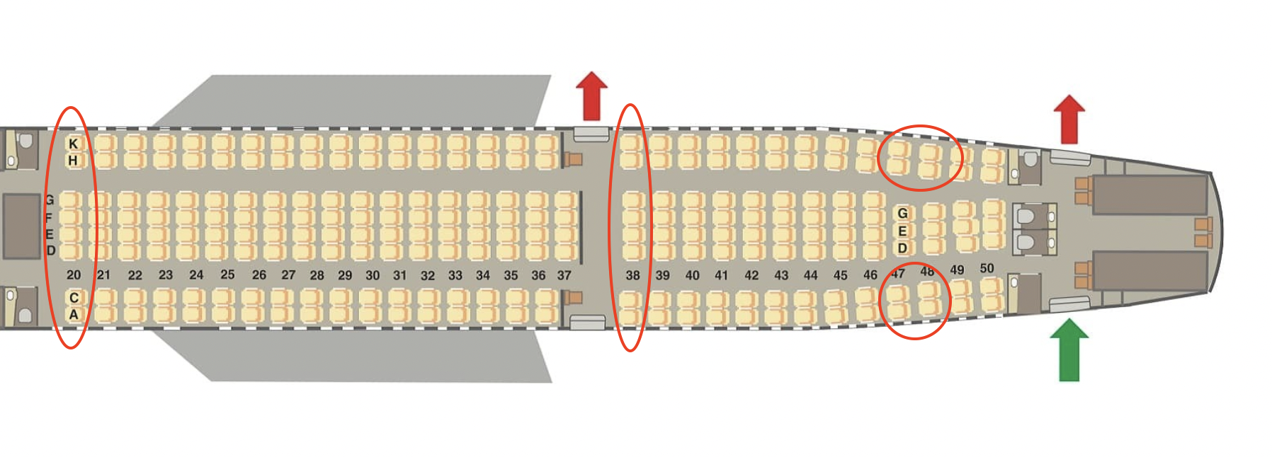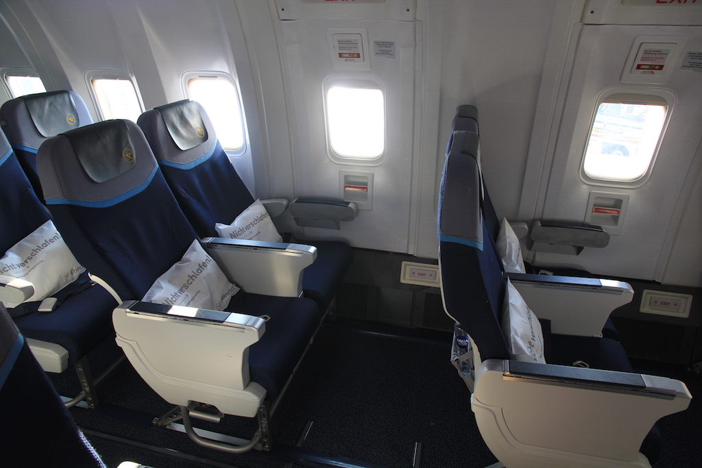 Ein Geheimtipp sind die seitlichen Doppelsitze in Reihe 47 A/C und 47 H/K, sowie 48 A/C und 48 H/K. Hierbei handelt es sich zwar um normale Economy Class Sitze, allerdings wird hier der Gang deutlich breiter, da in der Mitte nur noch drei, anstelle von vier Sitzen verbaut sind. Dies gibt etwas mehr gefühlten Raum und macht die Sitze vor allem auch ruhiger.