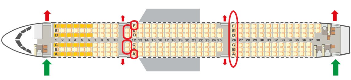 Im hinteren Drittel des Flugzeuges können wir die Plätze in Reihe 26 empfehlen, da diese ebenfalls am Notausgang liegen und somit über mehr Beinfreiheit verfügen.