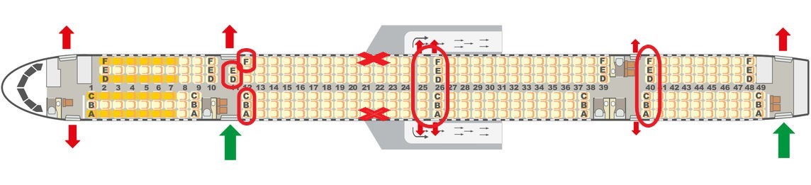 In diesem Flugzeugtyp sind besonders die Sitze in Reihe 11 und 12 zu empfehlen. In Reihe 11 Sitzt man zwar etwas weiter vom Fenster entfernt, hat aber eine große Beinfreiheit. In Reihe 12 auf den Plätzen A und F sitzt man direkt am Fenster und hat eine extrem gute Beinfreiheit.