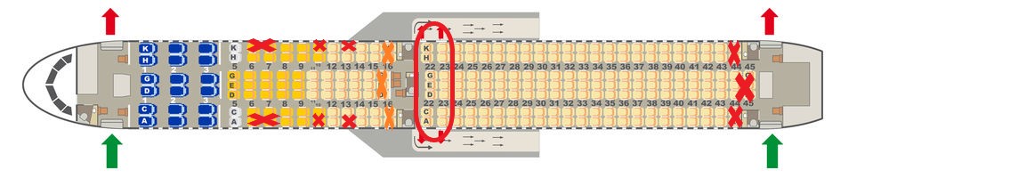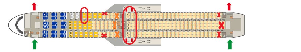 Meiden sollte man unserer Meinung nach immer die Plätze direkt vor den Toiletten. Hier ist meist recht viel los und im schlimmsten Fall wird man von Gerüchen belästigt. Auch die Plätze 22A und 22F sind zu meiden, da dies Plätze sind, die wie Fensterplätze aussehen, aber über kein Fenster verfügen.