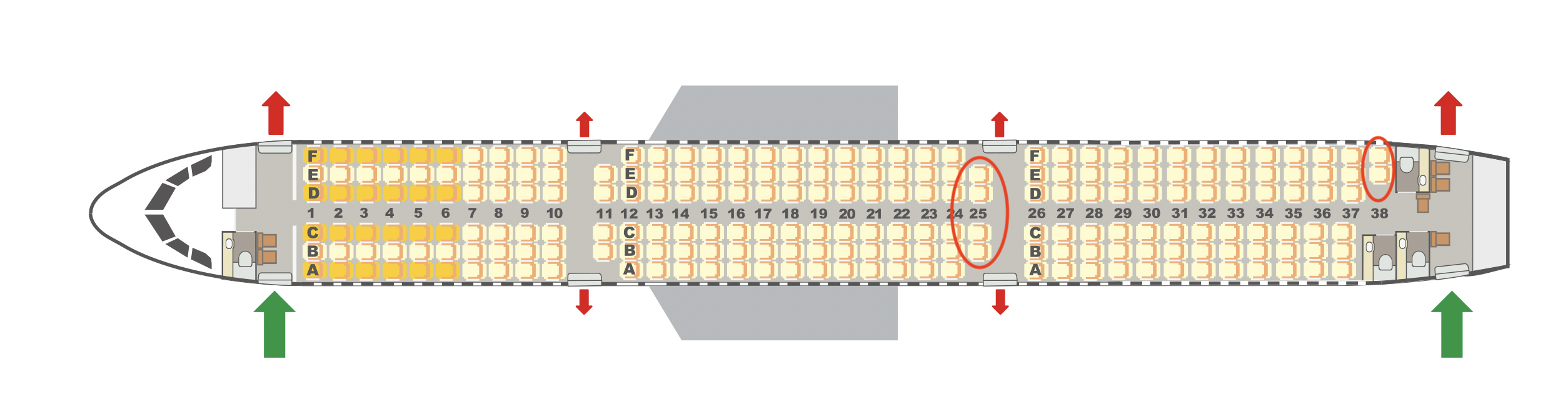 Besonders erwähnen wollen wir noch die Doppelsitze in Reihe 25 B,C,D und E, sowie in Reihe 38E und F. Hier hat man, gerade wenn man als Paar reist den Vorteil, dass man keinen andere Passagier neben sich hat, allerdings sollte man wissen, dass sich in Reihe 25 die Sitze wegen dem Notausgang dahinter NICHT nach hinten neigen lassen. In Reihe 38 hat man zudem die Toiletten direkt hinter und auch neben den Sitzen, was nicht immer besonders angenehm ist.
