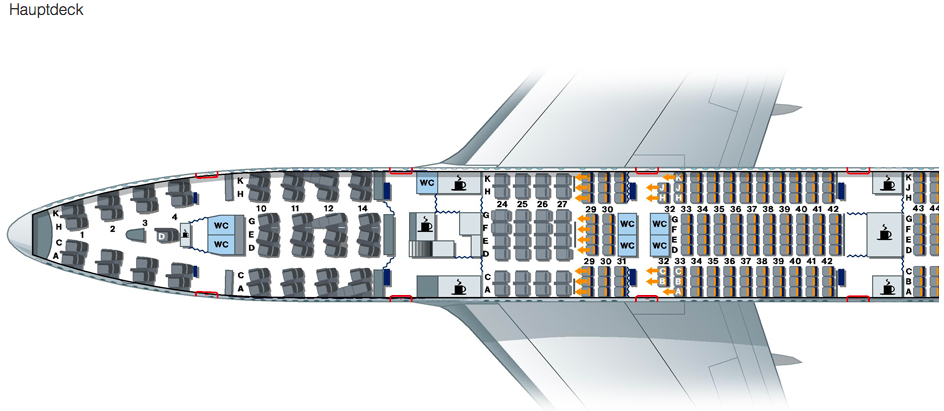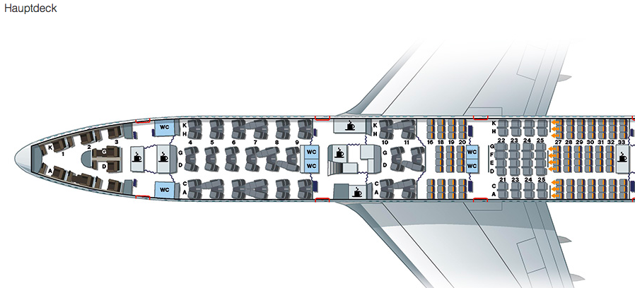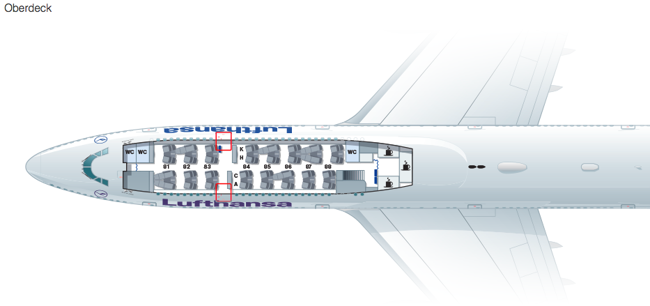 Eine absolute Besonderheit, stellen die Mittelsitze im Hauptdeck dar. Diese bieten deutlich mehr Freiraum aufgrund des größeren Winkels in der V Anordnung der Sitze. Besonders Alleinreisenden, oder auf Nachtflügen kann ich die D und G Plätze empfehlen.