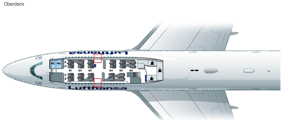 Hier sind wieder die Sitze an der Bulkhead in Reihe 81 und 84 interessant. Die Fensterplätze im Oberdeck der Boeing 747-400 bieten auch ein wenig mehr Freiraum im Fußbereich, was sie besonders zum Schlafen interessant macht. Ich fliege in der Boeing 747-400 sehr gerne im Oberdeck, versuche es allerdings in der Boeing 747-8 zu meiden!