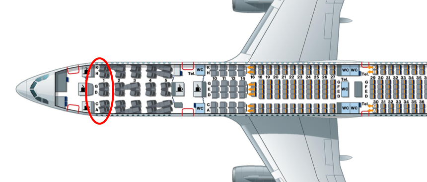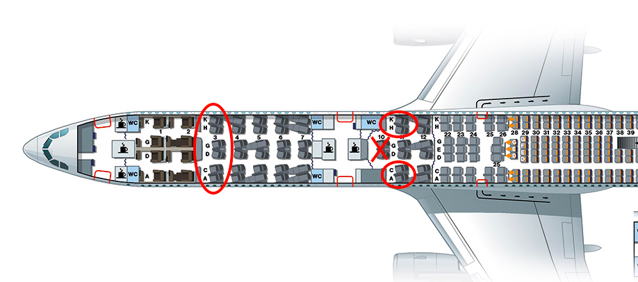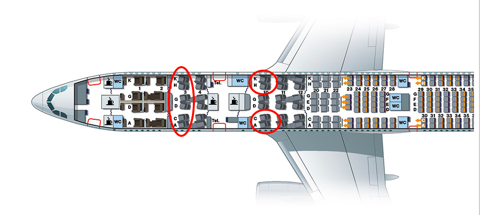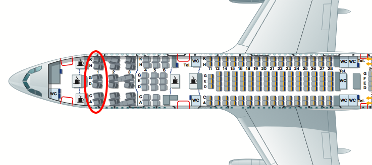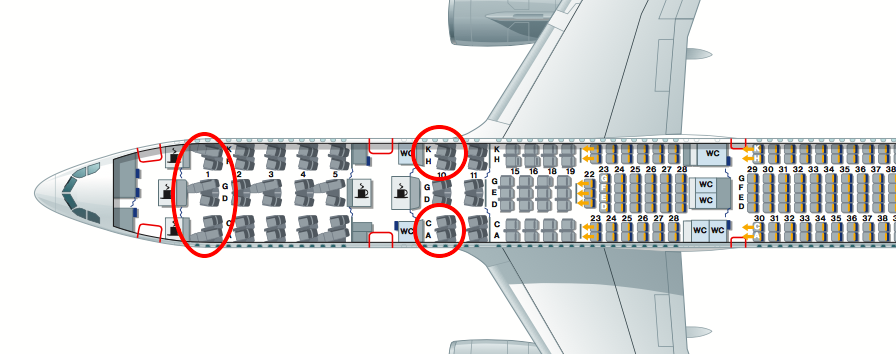 Auch die Plätze 10A/C und 10 H/K sind wieder aufgrund ihres großen Fußfaches an der Bulkhead zu empfehlen. Diese lassen sich auch kurz vor Abflug am Check In meist noch bekommen, da sie für Familien mit Babys geblockt werden.