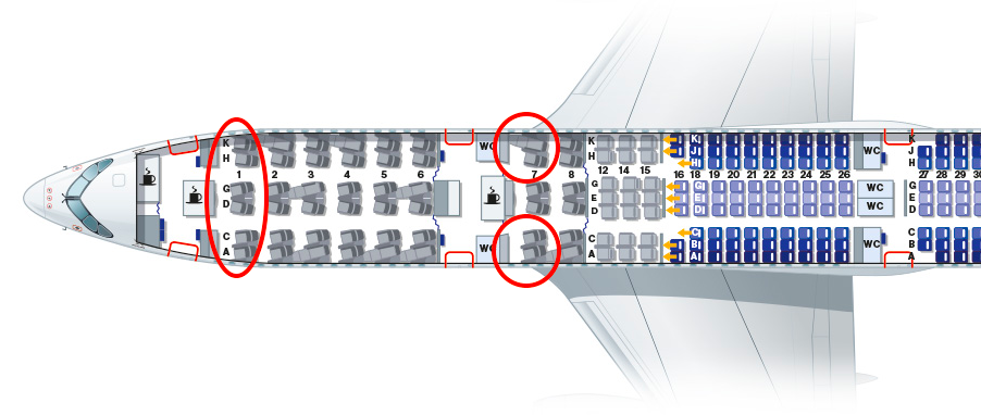 Ich habe auf dem Sitzplan einmal die Plätze markiert, welche ich reservieren würde. Dabei handelt es sich, wie bei den anderen Flugzeugen auch, um die Bulkhead Sitze.