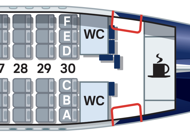 Da sich die Toiletten im Heck der Maschine befinden, herrscht häufig reger Verkehr durch vorbeilaufende Passagiere. Gerade auf längeren Flügen kann so eine „Toiletten-Schlange“ bis Reihe 25 reichen. Und hier bleibt zu erwähnen, dass das Gesäß der wartenden Passagiere genau auf der Höhe des eigenen Gesichts ist. Durch die Enge des Ganges kommt es hier auch zwangsläufig zu ungewollten Berührungen an diversen Stellen.