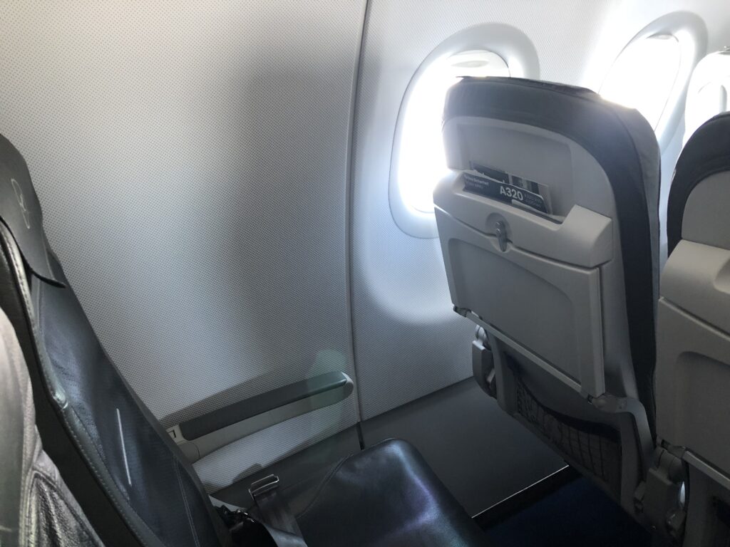 Schnell stellt sich in dieser Reihe ein beklemmendes Gefühl ein. Durch das fehlende Fenster und die Nähe der Lehne des Vordersitzes kann es durchaus zu Platzangst kommen. Hat man die Reihe für sich alleine, mag das noch kein Problem darstellen. Bei einem voll besetzten Flugzeug allerdings verschlimmert sich das Bild noch. Hierbei ist es egal, ob der vermeintliche Fensterplatz oder Mittelsitz eingenommen wurde. Man sitzt in etwa so komfortabel wie ein Huhn in einer Legebatterie.