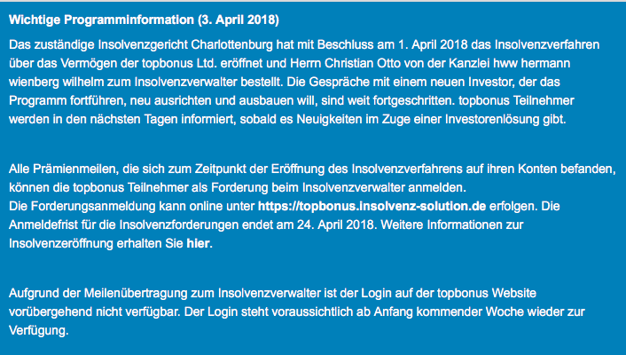 Topbonus befindet sich seit dem 01. April offiziell im Insolvenzverfahren. Zuvor befand man sich über ein halbes Jahr im vorläufigen Insolvenzverfahren, in welchem man das topbonus Programm nur sehr eingeschränkt nutzen konnte, um es einmal vorsichtig auszudrücken.