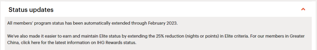 Auch der IHG Rewards Club hat sich jetzt noch einmal entschieden, den bestehenden Status ohne die Erfüllung von Kriterien zu verlängern. So behält jedes Mitglied, das aktuell den IHG Gold, Platinum oder Spire Elite hat, diesen bis mindestens März 2023. Und das obwohl die Hürden für die Re-Qualifikation schon um 25% reduziert wurden.