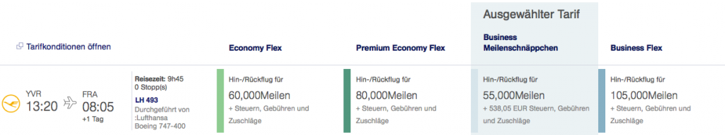 1. Wow! Frankfurt – Vancouver. Ein 10h-Flug in der Busibess für 55000 Meilen + 538 Euro. Das sind bei Preisen von ca 3900 Euro Normaltarif, ca 6 Cent pro Meile~~ einen so hohen Wert hat man nicht alle Tage.. nur schade, dass ich gerade nichts in Vancouver vorhabe^^
