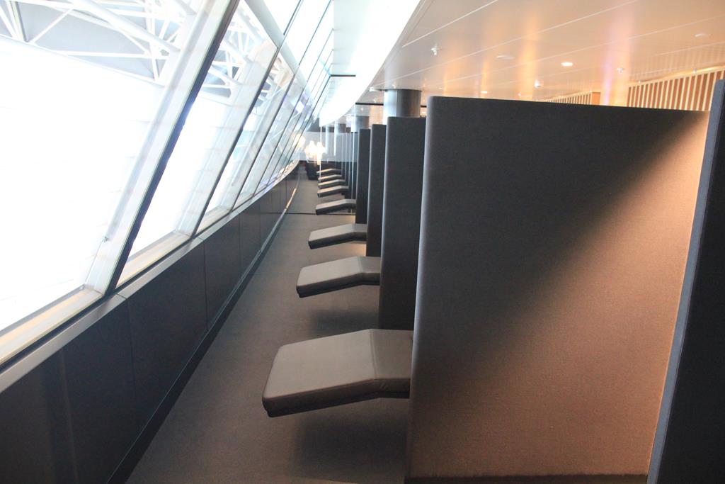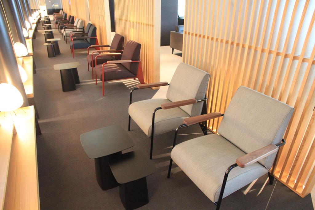 Kommen wir zuerst zur Businesslounge. Die Lounge (aber auch die Senatorlounge) ist nach einem Zonenkonzept aufgeteilt, dass heißt es gibt verschiedene Rückzugsbereiche für die Gäste. Neben einem Ruhebereich, finden die Gäste im hinteren Bereich auch Arbeitsplätze. Davor gibt es mehrere dutzend Sessel, die zum Entspannen einladen.