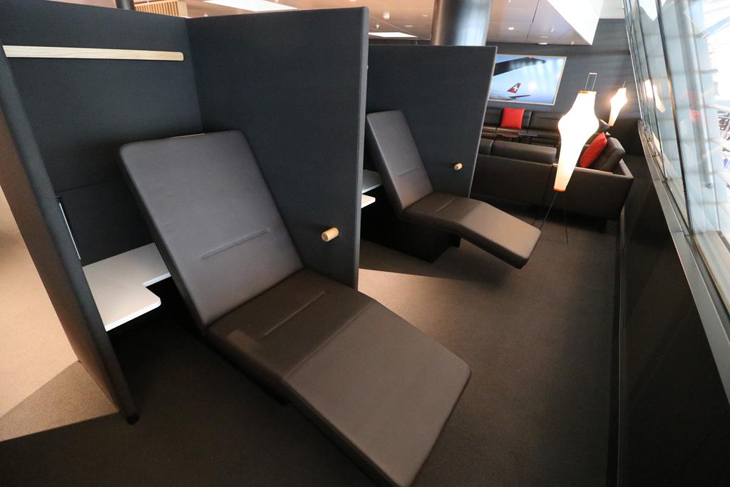 Der Ruhebereich befindet sich im oberen Stockwerk der Lounge. Hier gibt es neben Couchecken auch semi-private Liegen und einen Bereich mit Sesseln und TV-Flatscreens.
